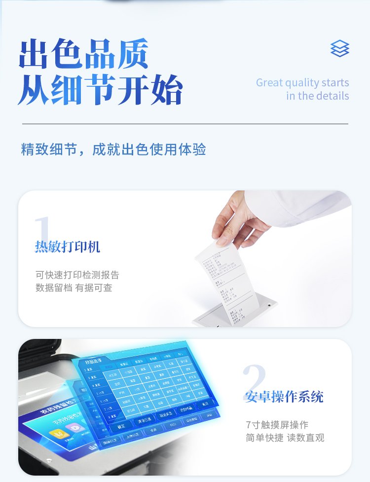 8、打印機采用串口5v打印,可選擇手動打印或者自動打印,三分鐘出打印結果,打印格式為檢測人姓名、吸光度差值、檢測時間、檢測機構、樣品名稱及結果判定。