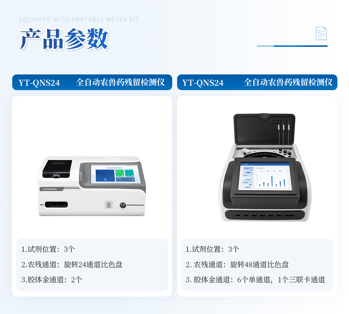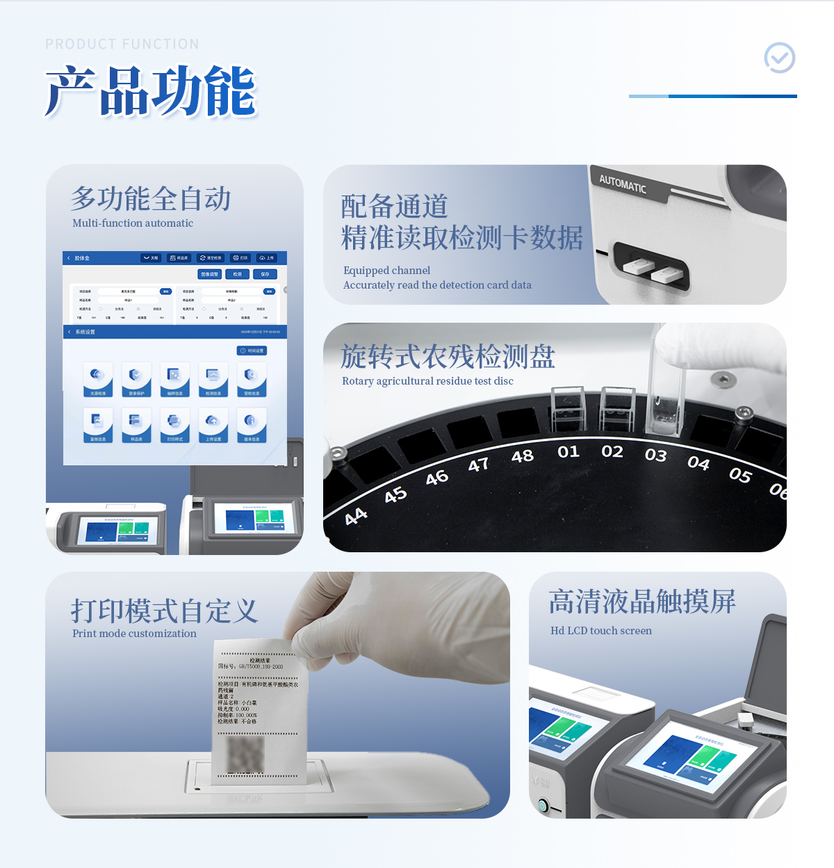 1. 試劑位置:3個 | 2. 農殘檢測盤:旋轉24通道比色盤,可任意選擇檢測通道,自動對應選擇通道。 | 3. 膠體金通道:2個,可讀取檢測卡結果,自動采集、處理分析,自動判斷檢測結果,并具備自動判空功能。 | 4.系統配置:10.1寸高清液晶觸摸屏,采用ARM Cortex?-A7,RK3288/4核處理器,運行內存1GB。Android7.1.1 系統分辨率1280×800。 | 5.恒溫系統:具有自動加溫溫控系統,精準恒溫37℃,精度±0.1℃。 | 6.添加系統:儀器按照試劑要求自動、按時、按量加入試劑,并且自動對未正常放置的樣本或異常的樣本進行檢查并提示。 | 7.清洗功能:儀器具備回流及自動清洗管路功能,避免試劑污染。 | 8.混勻功能:設備具備自動混勻功能。 | 9.光源校準:設備可自動校準,確保檢測準確度。 | 10.實時監控:儀器測試過程中屏幕顯示運行狀態,可實時查看。 | 11.數據存儲:內部存儲16GB,可存儲500萬條數據。 | 12.樣品多選功能:設備具備樣品一鍵多選功能,選擇樣品自動匹配檢測通道。 | 13.項目預設:可提前設置單個及多個相同或不相同的檢測任務,可單次或者多次調取,減少檢測時間。 | 14.自定義打印系統:內置自定義打印系統,可按需靈活設置開啟或關閉:產品合格證(國家農業部標準),二維碼,抽樣信息、檢測信息,受檢信息等信息的打印。 | 15.A4版本報告打印功能:設備可自動生成A4版報告,A4報告帶二維碼,可掃描二維碼生成電子版,并可識別真偽。 | 16.傳輸方式:儀器配備無線通信模塊: 4G(APN)通訊模塊、Wifi模塊,藍牙傳輸模塊,同時具有USB接口以及RJ45接口能以多種方式實現數據保存和數據傳輸功能,設備數據可以同步上傳至平臺。 | 17.系統17.數據監管系統:設備自帶監管平臺,并可同步對接監管平臺,數據可局域網和互聯網數據上傳,檢測結果可直接傳至食品安全監管平臺。達到食品安全問題預估、預警。 | 18.系統遠程更新功能:無需設備返廠,即可遠程實時升級全新系統,節省時間成本及避免運輸造成設備損。 |