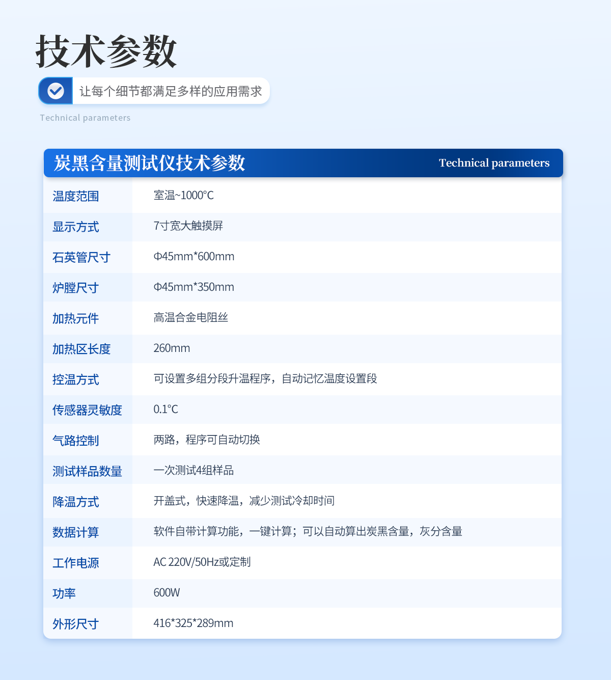 1. 采用開蓋式爐體結(jié)構(gòu),方便放置樣品且散熱效果更佳。 | 2. 爐膛采用超長(zhǎng)加熱單元,可同時(shí)測(cè)試4組樣品,大大提高測(cè)試效率。 | 3. 軟件自帶計(jì)算功能,可以一鍵自動(dòng)計(jì)算出炭黑含量、灰分含量,非常得方便快捷。 | 4. 采用PID精準(zhǔn)控溫,控溫精度高,溫度范圍大,爐膛溫度均勻性高。 | 5. 7寸液晶觸摸屏顯示,可一鍵操作啟動(dòng),設(shè)定恒溫時(shí)間,恒溫精度高; | 6. 智能化可編程控制,可設(shè)置多組分段升溫程序。 |