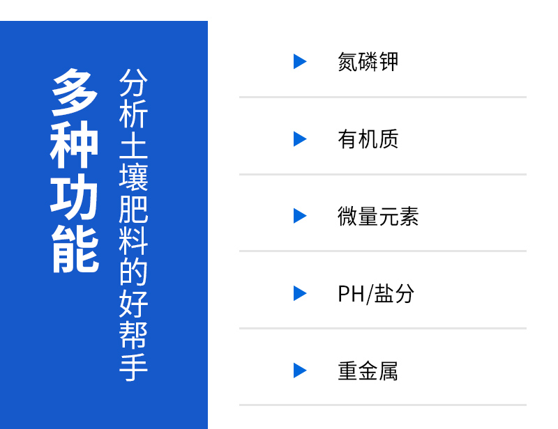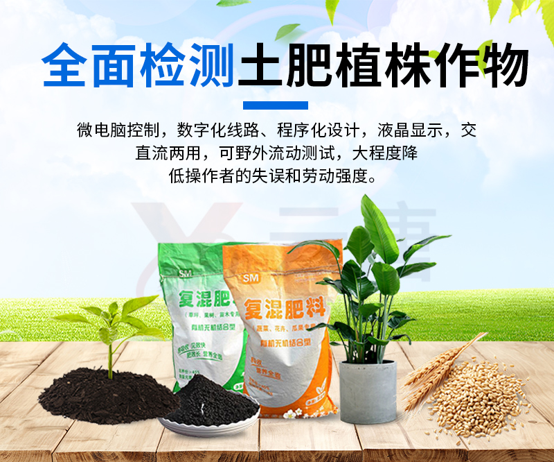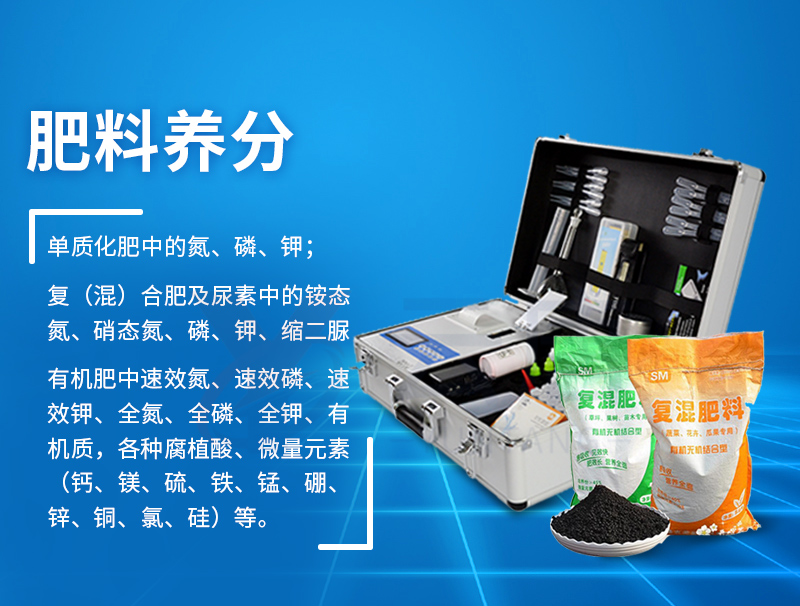 肥料養(yǎng)分:● 單質(zhì)化肥中的氮、磷、鉀; ● 復(混)合肥及尿素中的銨態(tài)氮、磷、鉀; ● 有機肥中速效氮、速效磷、速效鉀、全氮、全磷、全鉀、pH、有機質(zhì)等。